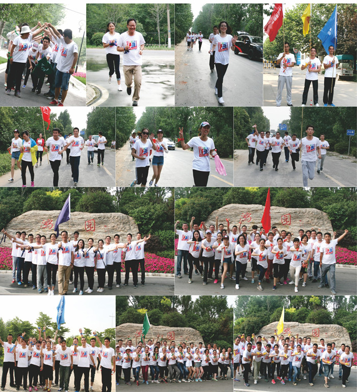 千呼萬喚始出來的終極挑戰-勇往直前(2800畝鴻園環行)在最后等待著考驗大家的意志。由景觀示范區門口出發沿鴻苑路向北途經興達路-東四環-任莊村路-鴻寶路,最終回到景觀示范區。中途設三道關卡,每一方陣需通過層層考驗,品嘗含有酸、甜、苦、淡、咸等五種味道的飲品,并接受相應處罰后方可繼續前進。勇往直前考驗的不僅僅是每一個人的耐力與毅力,更是對一個團隊凝聚力與否的檢驗。出發前領導們和我們的各方陣隊員們于“鴻園”石刻前進行了“全家福”環節,洋溢著燦爛微笑的臉龐上寫滿了每一個鴻寶人的張揚與自信。