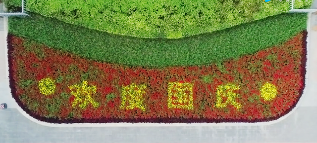 五星紅旗迎風飄揚,萬盆花卉齊展生機,營造出濃濃節日氛圍。