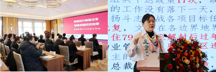 在認(rèn)真聽取各位高管領(lǐng)導(dǎo)的總結(jié)發(fā)言后,集團(tuán)總裁袁曉曦以《底層運(yùn)行儲(chǔ)備過冬 穩(wěn)健卓越欣欣向榮》為題發(fā)表鴻寶集團(tuán)2022年度工作報(bào)告。曉曦總指出,2022年國際形勢(shì)風(fēng)高浪急,國內(nèi)環(huán)境艱巨繁重,但大戰(zhàn)大考煉真金,鴻寶集團(tuán)在二十四字戰(zhàn)略方針指導(dǎo)下逆勢(shì)奮進(jìn),堅(jiān)持底層運(yùn)行,樹立底線思維,錨定發(fā)展目標(biāo),東壩頭大橋全面開工,銀團(tuán)融資逆勢(shì)突圍,海南總部竣工交付,物業(yè)抗疫三年堅(jiān)定口碑,取得了卓越成績,也迎來了經(jīng)濟(jì)向好、欣欣向榮的春天。