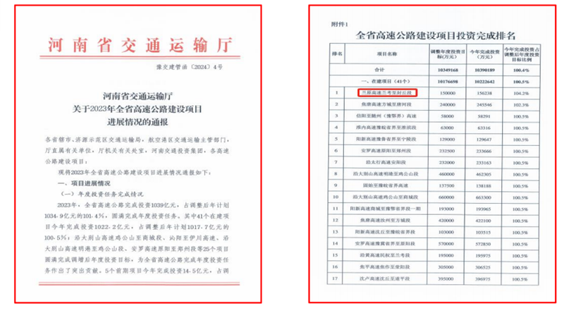 2024 年 1 月,河南省交通運輸廳通報《關于 2023 年全省高速公路建設項目進展情況》(豫交建管函〔2024〕4 號),蘭封高速項目 2023 年度完成項目投資 15.6 億元,為河南省交通運輸廳下達年度投資計劃的 104.2%,項目投資完成率在全省 41 個在建高速公路項目中排名第一,實現了工程建設“開門紅”。