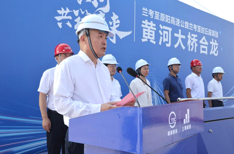 7月28日上午 9點28分,蘭原高速蘭考至封丘段黃河特大橋主橋合龍儀式在項目現場隆重舉行。開封市委常委、蘭考縣委書記陳維忠,開封市交通運輸局副局長韓國慶,新鄉市交通運輸局副局長強勇,封丘縣縣長王振海,蘭考縣副縣長李青,上海城建集團副總裁孫桂峰,河南鴻寶集團董事長、項目公司董事長袁桂寶,上海城建市政集團黨委書記、董事長董澤龍,上海城建集團中原區域總部黨委副書記、總經理丁煒等領導,以及項目業主單位、施工單位、監理單位等項目參建人員及嘉賓共同見證了這一歷史性時刻。